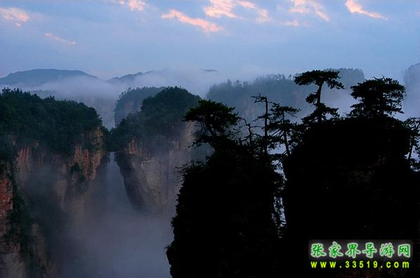 在“后花園”的對(duì)面,是一座巍峨的山巒,山上古木參天,遮天蔽日。森林中常有野山羊出沒(méi),夜深人靜之際,常能聽(tīng)到野羊羔“咩洋”地叫聲,因此被稱作“羊寨”。民國(guó)時(shí)期,此地曾為土匪占領(lǐng),直到現(xiàn)地,山上還殘留有卡門、暗堡、斷壕、屋場(chǎng)、水井、碓臼、磨坊等殘跡。粗大的松樹(shù)上還留有土匪當(dāng)年留下的“V”字型標(biāo)志。站在“山寨”上,舉目眺望,可看見(jiàn)金鞭溪全景,只見(jiàn)一條美麗的溪水從數(shù)百座石林中緩緩穿過(guò),顯得是那樣的幽靜、和諧。從“后花園”向前步行約100米,便是袁家界又一處絕世奇觀——迷魂臺(tái),走上迷魂臺(tái),只見(jiàn)上百座山巒拔地而起,峰涌而至,它們姿態(tài)萬(wàn)千、氣勢(shì)非凡;有的似“天狗望月”,有的像“海螺出水”;有的像“將軍列隊(duì)”,有的如“一柱擎天”。幾道山坳和屏障將這些山巒有序的分開(kāi),使這些石峰更顯得層次分明,井然有序,在萬(wàn)道霞光的點(diǎn)綴下,顯得蔚為壯觀,不同凡響。這更像是一幅畫家筆下的水墨丹青,“迷魂臺(tái)”攬勝,真宛如仙境神游啊。
