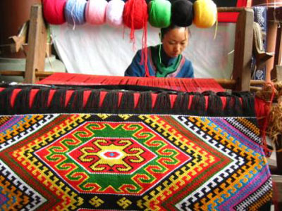 土家語中的“西蘭卡普”是一種土家織錦。“西蘭”是“被面”,“卡普”即“花”,“西蘭卡普”就是土家族的花鋪蓋,是土家姑娘的珍貴嫁妝。西蘭卡普多以絲、棉、麻為原料,一般以紅、藍、青三種顏色為經線,緯線可以自由選擇顏色。用古式織機、挑花刀采取通經斷緯、反面挑織的方法手工挑織而成。西蘭卡普構圖大方,織工精巧,花樣豐富,色彩鮮明熱烈而古樸,被稱為土家文化的活化石。