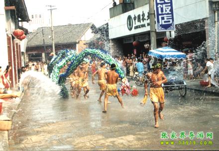 張家界潑水龍又叫“澆水龍”,于唐朝時期由移居本地的白族興起演變而成,在永定區(qū)的尹家溪鎮(zhèn)西尹村、莫家崗村十分盛行,是當?shù)?a class="insidelink" href="http://m.prettyhousebiz.com/fengqing/1130174734.html" target="_blank" title="土家族">土家族,白族、苗族在天熱干旱時節(jié)求雨祈福的一種形式。一旦出現(xiàn)旱災,當?shù)仡^面人物就會出來組織潑水龍,演出極其隆重。