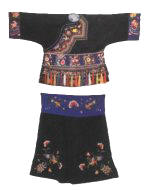 ,外套青色滿肩馬褂,腰系桃花兜,并配撤穗荷包,下著青色寬腳褲,腳穿白布襪子和天官云頭鞋。婦女頭上蒙白色繡花帕,兩耳垂環(huán),手戴鐲子或戒指,外套繡花圍裙,用繡花飄帶系著,右上胸佩掛三吊或五吊銀質牙簽。下著蘭色寬褲,腳纏白色裹腳布,穿繡花尖尖鞋。無婚女性則挽“簪巴”,挽于腦后的稱“粑粑”,挽于頭頂的稱高把簪,簪上套有網,橫插簪子;兒童衣服多繡花,外圍肚兜,頭戴虎頭鼓針菩薩帽,頸戴“項圈”、“百家鎖”等,手腕套有銀圈,上系小吊,吊上有錘、鈴、鞋、斧、簽等。