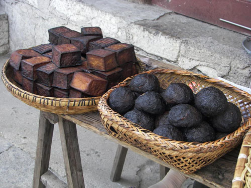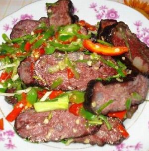 名稱: 血豆腐 介紹: 血豆腐,就是將豆腐和豬血、豬肉及花椒、辣椒等佐料拌成泥狀,捋成卵形,以竹篩置火炕上,煙熏烤成臘黃,吃起來耐嚼味香,是土家特色菜,當?shù)厝顺R云湎戮啤?在張家界的飯館里很難吃到正宗的土家特色菜,可以去做土味的特色餐館去解解饞。但是最正宗還是鄉(xiāng)下人家家里自己熏的,那才叫一個好吃?。?!