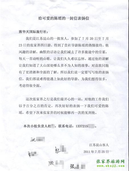 游客杜小姐一行為表揚(yáng)導(dǎo)游陳瑤寫來表揚(yáng)信致我張家界華天國旅
