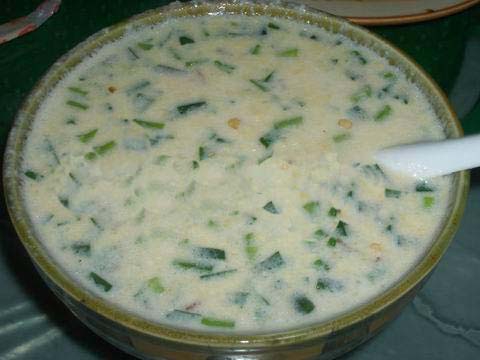 將用水浸泡過的黃豆用磨子磨碎,摻入切細的青菜葉,然后用溫火煮熟即可。此樣菜雖做法簡單,但營養(yǎng)價值極高且味鮮美,為當?shù)厝顺S玫囊坏啦恕?/p> ■土家糍粑